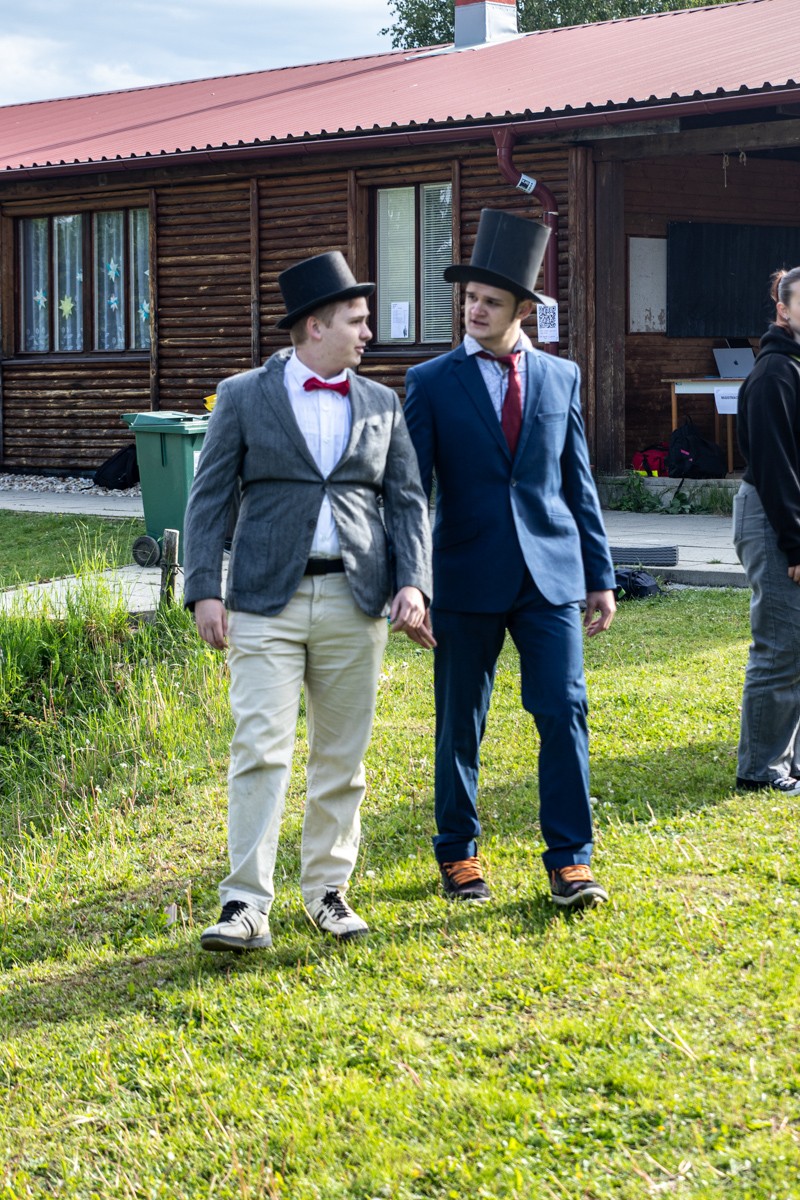 Jakmile se blížil start, začali jsme se konečně chystat – snažili jsme se ještě něco přiučit a převlékali se do kraťasů, protože najednou bylo vedro. Vystartovali jsme – nejdřív jsme nemohli najít samotný start, ale nakonec se to povedlo. Pak už šlo všechno v pořádku, až na strmé kopce a hodinovou čekačku. Po doběhnutí jsme jim snědli všechny párky v rohlíku a zase jsme se pustili do blbnutí – házeli jsme pneumatikou, hráli si s lany a znovu si házeli a kopali s míčem.